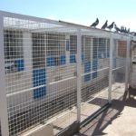Nuestras instalaciones se componen de seis compartimentos de 1,5 m2 cada uno, 4 para las palomas viajeras y 2 para la reproducción. Cada compartimento posee suelo de rejilla con un foso de unos 25 cm. Delante de los palomares, un parque de 9 metros de largo por 1,20 m de ancho con puerta de corredera y una sola entrada o trampilla para las palomas.